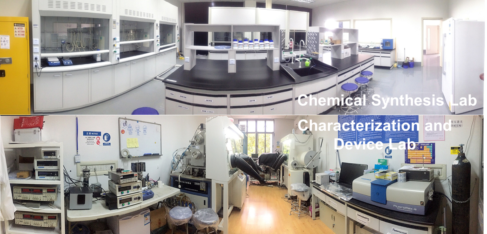 目前,我们课题组拥有完整的化学实验室(有机半导体材料的合成及表征)和优异的器件实验室(有机/钙钛矿太阳能电池及柔性热电元件的制备与测试、电荷输运机制研究)。现有的实验设备包括:1)材料制备手段,例如旋转涂膜仪、恒温恒湿试验箱,2)结构功能表征手段,例如紫外可见光分光光度计、荧光分光光度计、电化学工作站,3)器件的制备与测试手段,例如热蒸发真空镀膜机、氮气手套箱、太阳能模拟光源、源表、外量子效率测量系统,4)材料和器件的输运研究手段,例如液氮型低温恒温器系统、温度控制仪、信号发生器、示波器、激光器及荧光寿命光谱仪等。